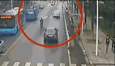 ▲电动自行车在机动车道“鬼探头”,被小车撞飞。