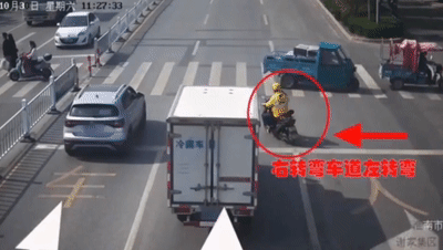 骑行电动自行车过马路时,请注意车辆盲区,不要在机动车之间随意穿梭,避免“鬼探头”事故的发生。